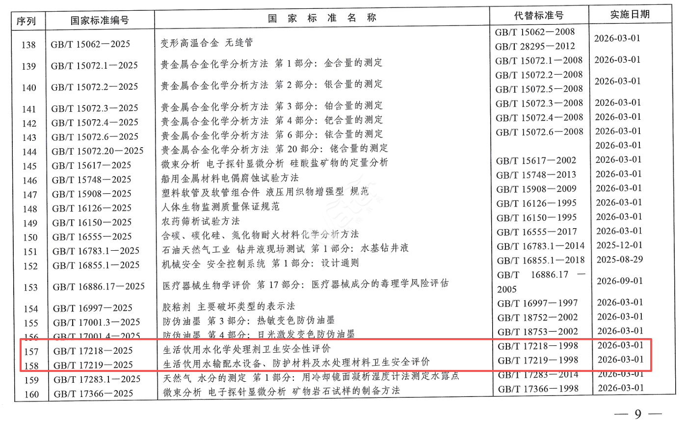 近日,國家市場監(jiān)督管理總局(國家標準化管理委員會)批準發(fā)布了《生活飲用水衛(wèi)生標準》(GB 5749-2022)兩項重要的引用標準《生活飲用水化學處理劑衛(wèi)生安全性評價》(GB/T 17218-2025 )、 《生活飲用水輸配水設(shè)備、防護材料及水處理材料衛(wèi)生安全評價》(GB/T 17219-2025),并將于2026年3月1日開始實施。